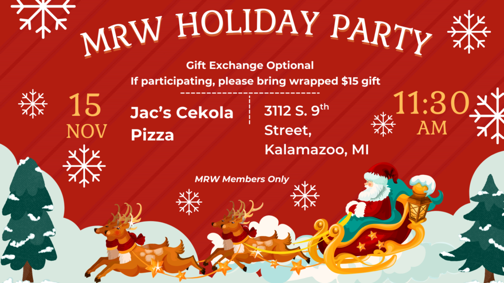 Visit the MRW Facebook Events Page for any potential time changes and details. Please R.S.V.P. below or on the Facebook Events Page.